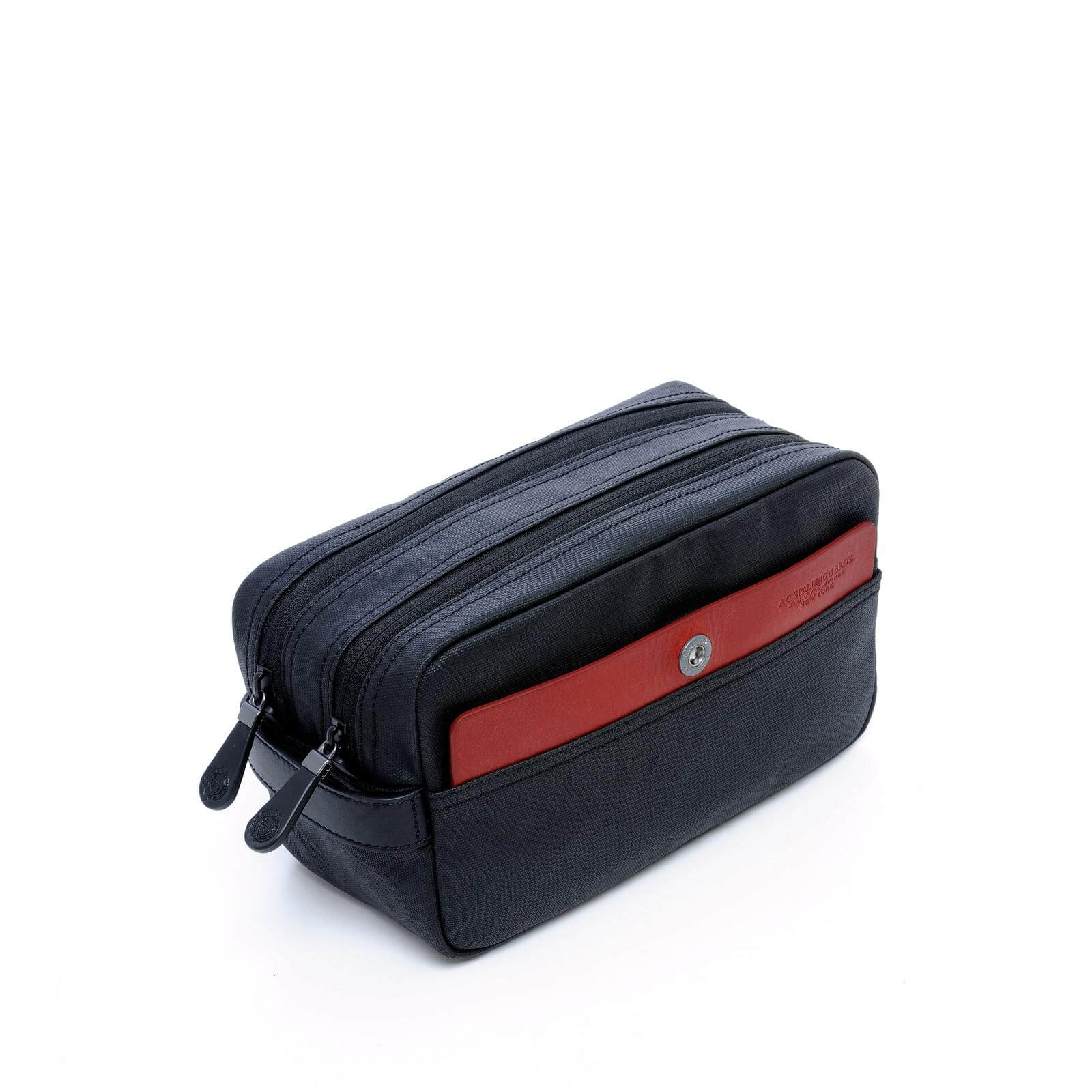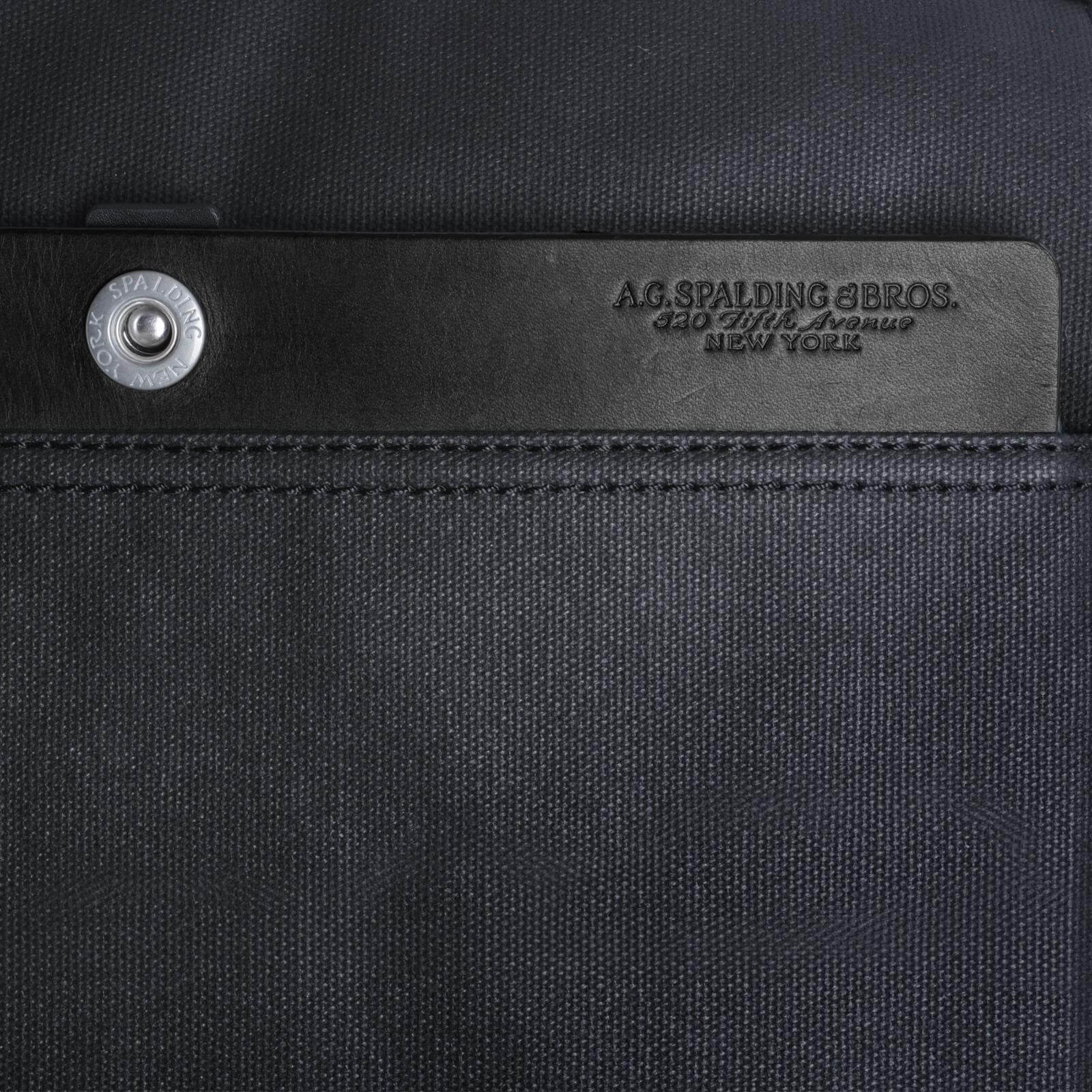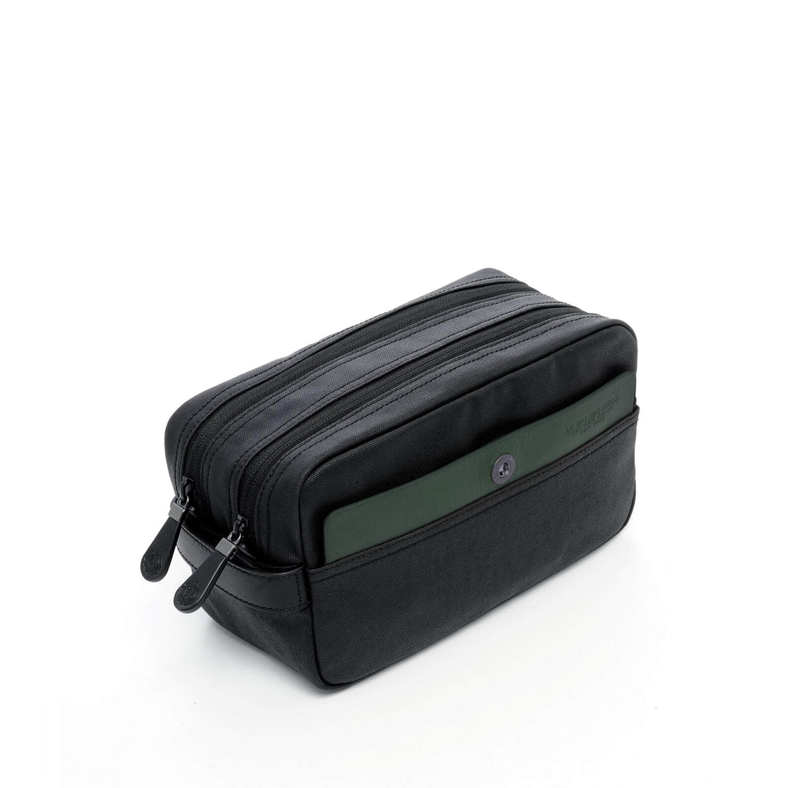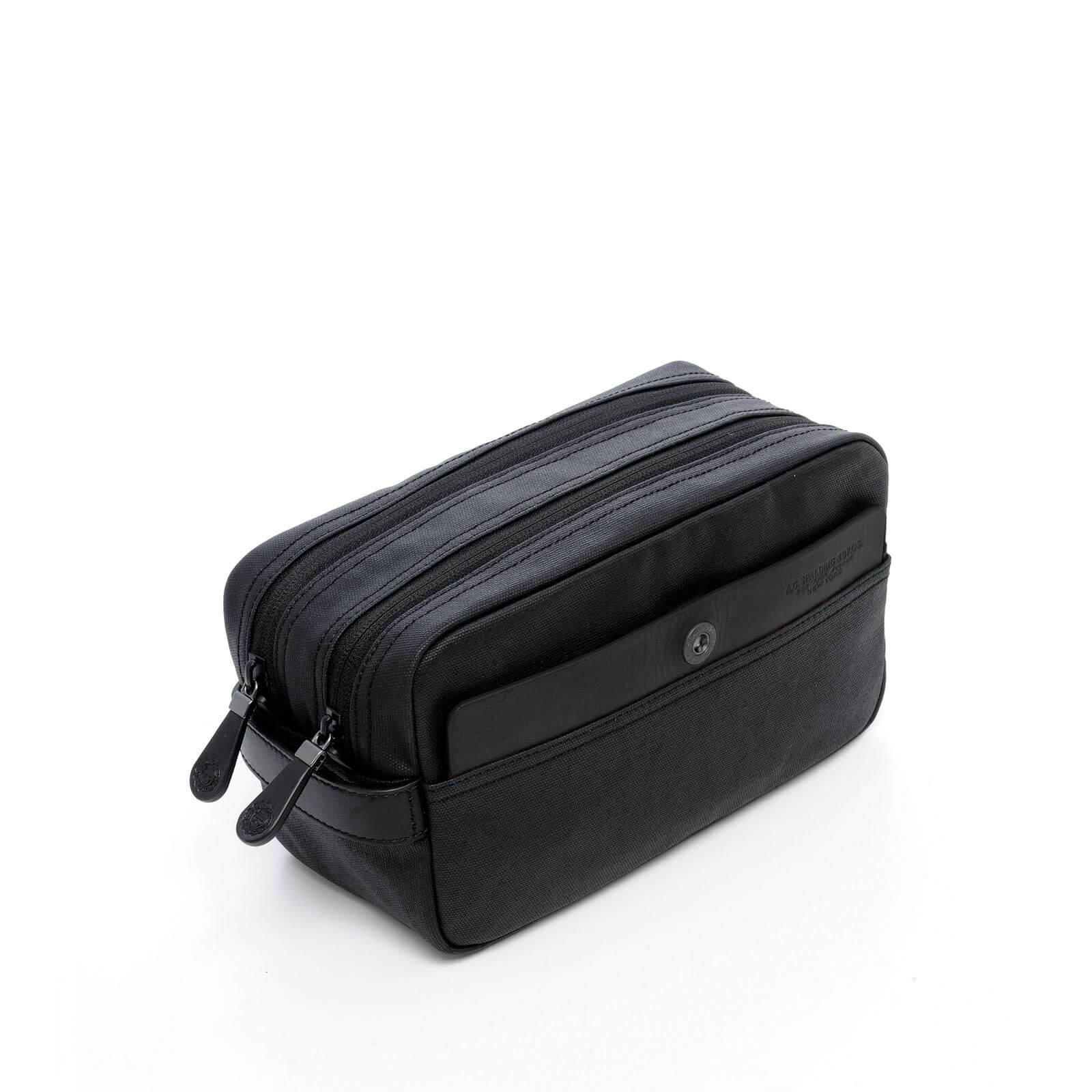 Beauty Matt in canvas resinato e particolari in cuoio. Tasca frontale chiusa con zip e con bottone personalizzato A.G. Splanding & Bros. 2 spazi centrali con 2 tasche interne- Maniglia in cuoio su lato destro.