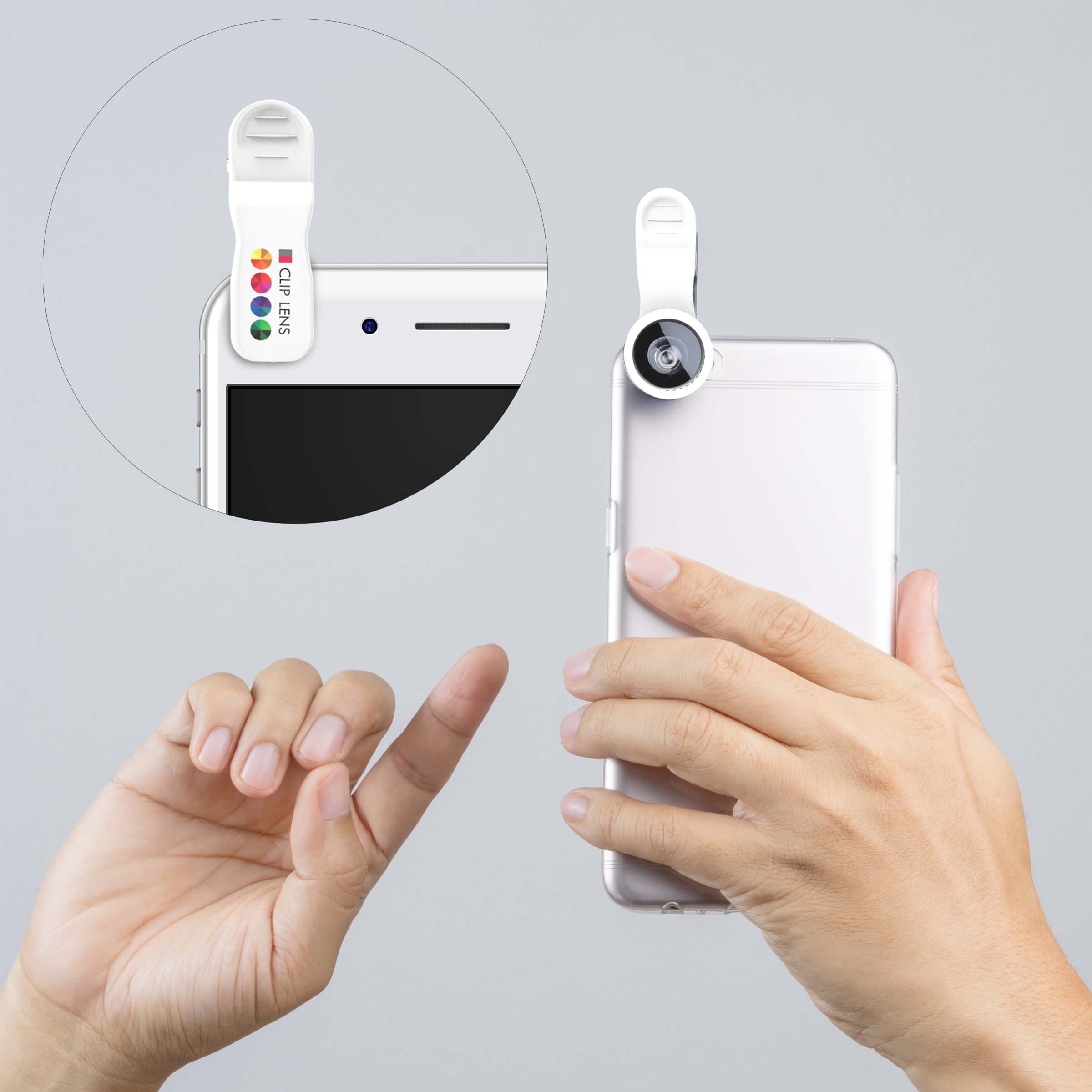 La Clip Lense ha 3 tipi di lente per la fotocamera dello smartphone: fish eye, macro e grandangolo. “Fish Eye” crea un effetto arrotondato dell’immagine (come l’occhio di un pesce). Il grandangolo cattura una visuale piu’ ampia e la marco si usa per immagini e dettagli ritratti molto da vicino. Grandangolo e macro sono un pratico set 2 in 1.