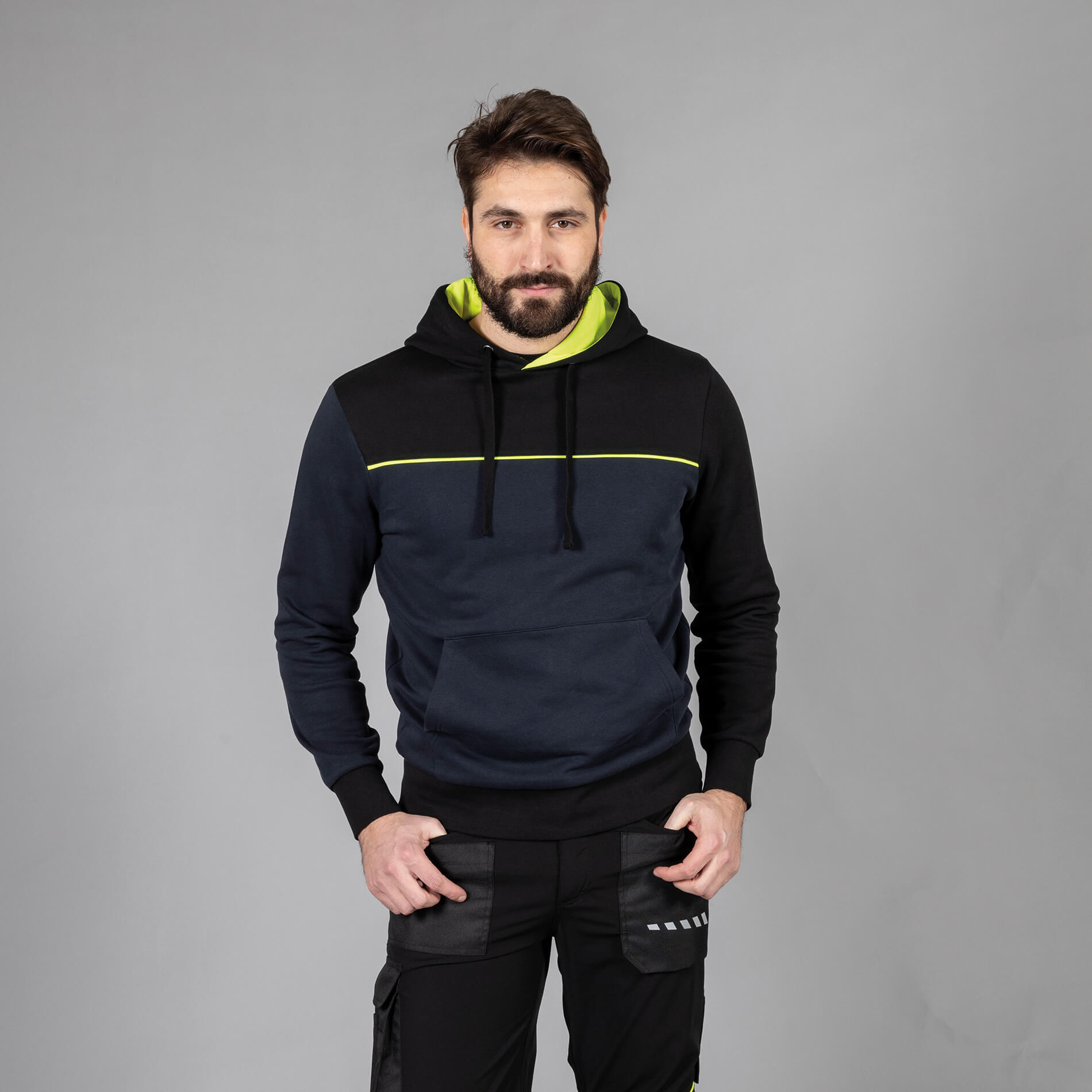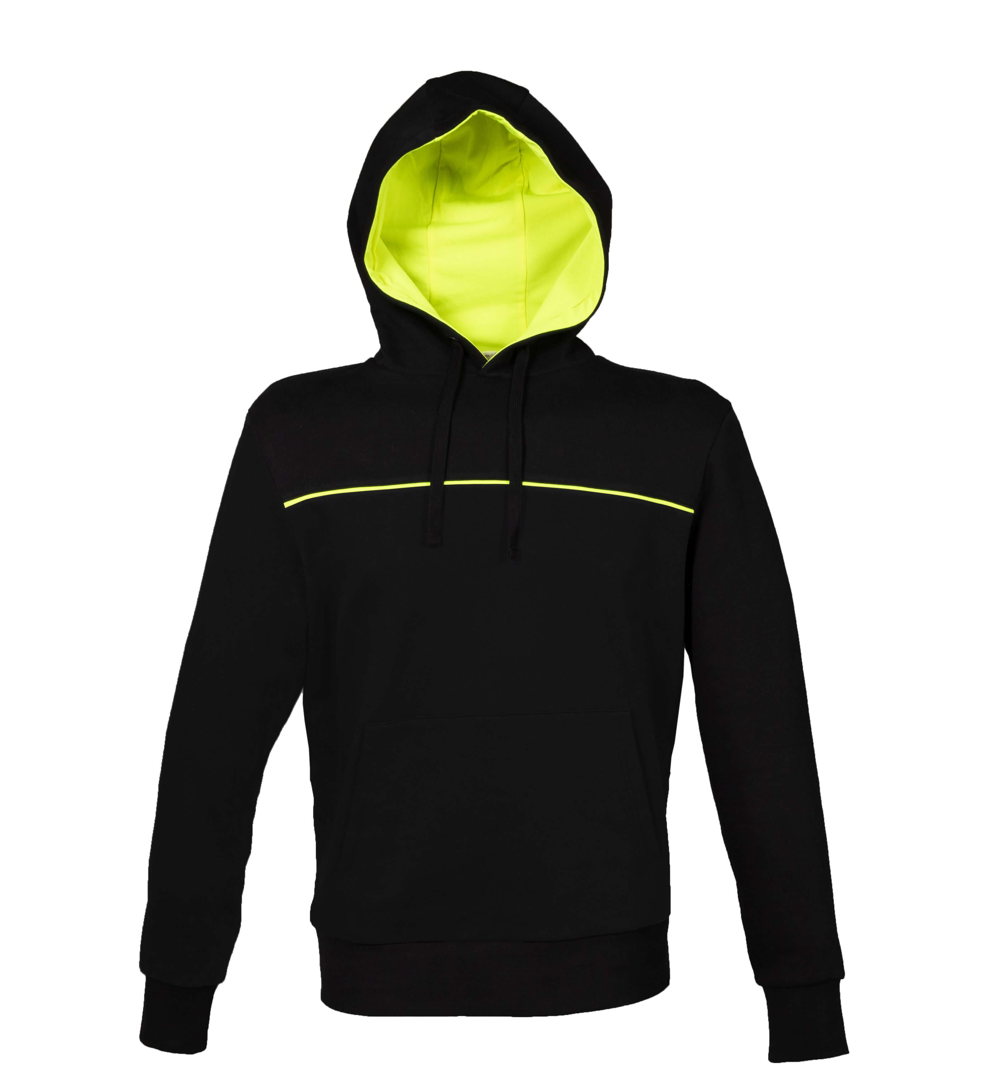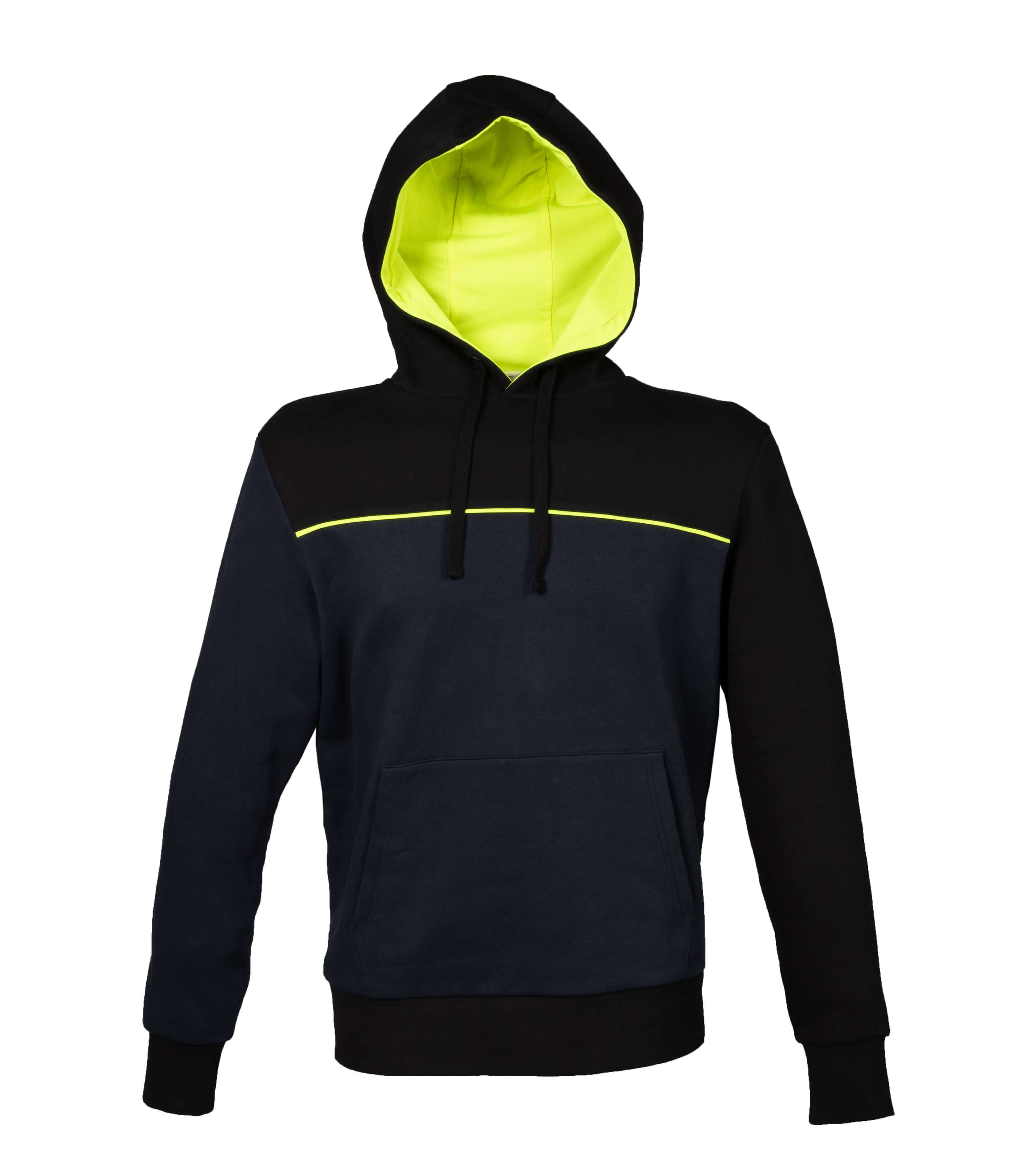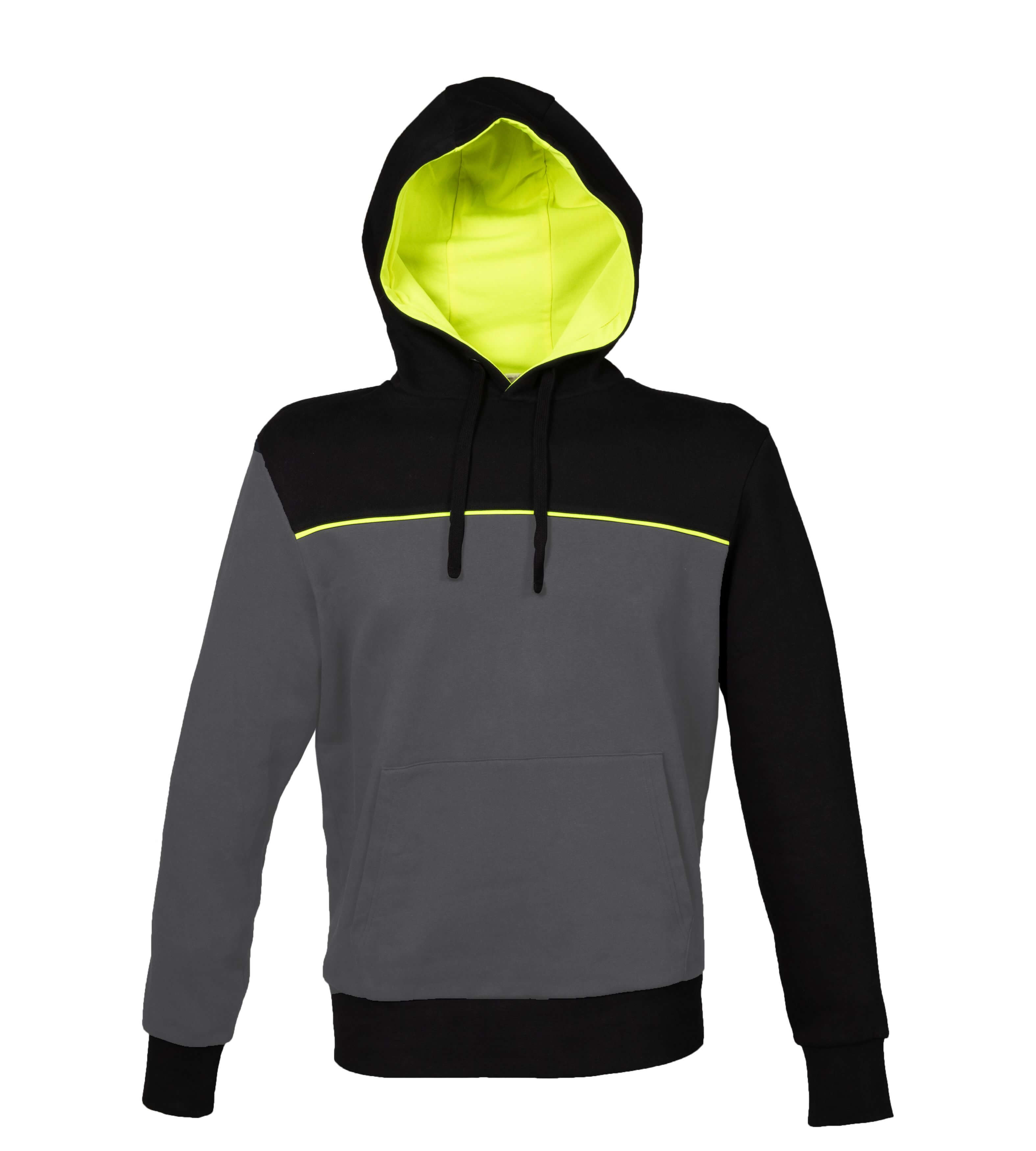 Felpa bicolore (80% cotone – 20% poliestere) con cappuccio foderato in jersey giallo fluo. Cordini neri. Attaccatura collo incrociata. Piping giallo fluo anteriore e posteriore. Tasca a marsupio. Polsini e fondo maglia in costina elasticizzata. Nastro di rinforzo giallo fluo all’interno del collo. Cuciture ribattute.