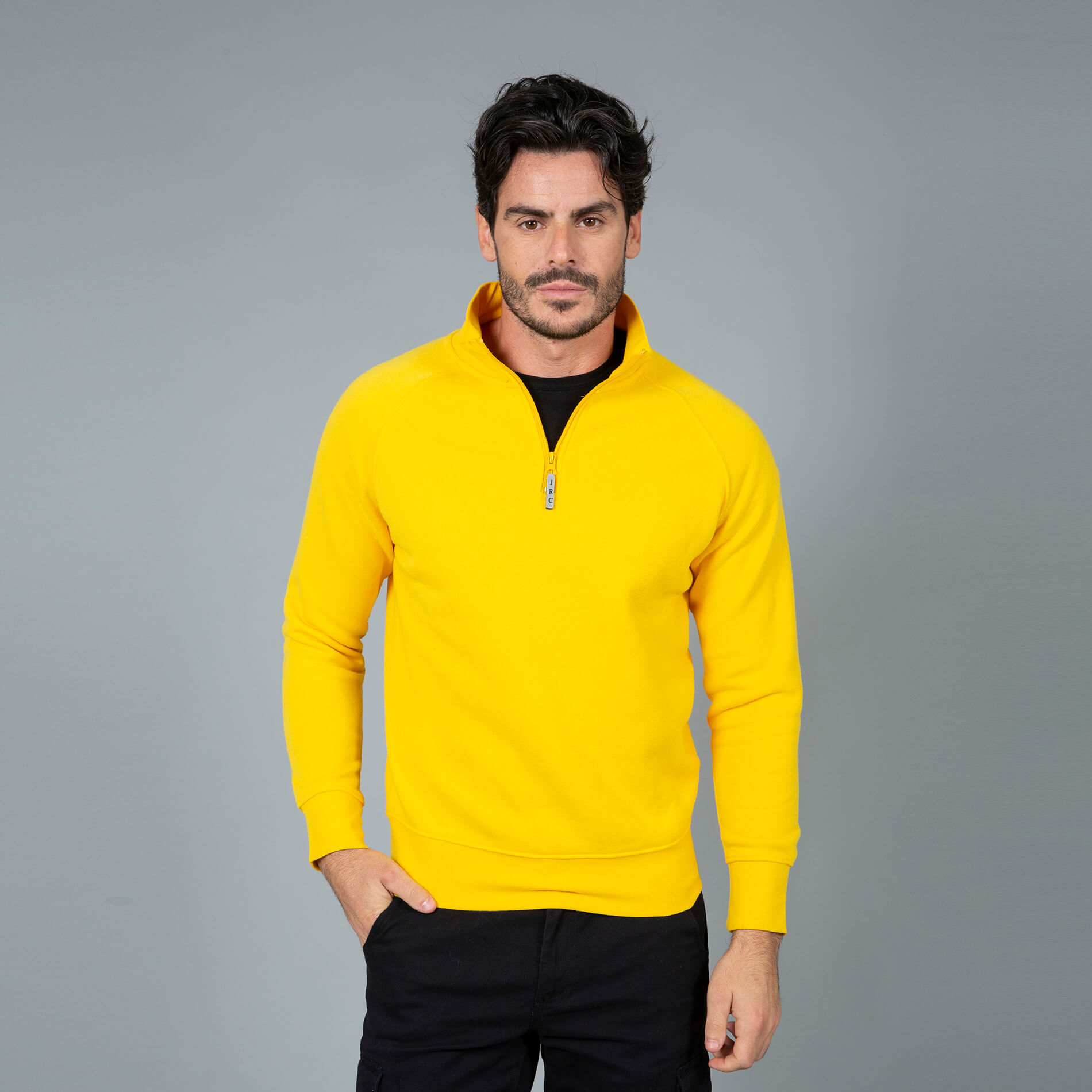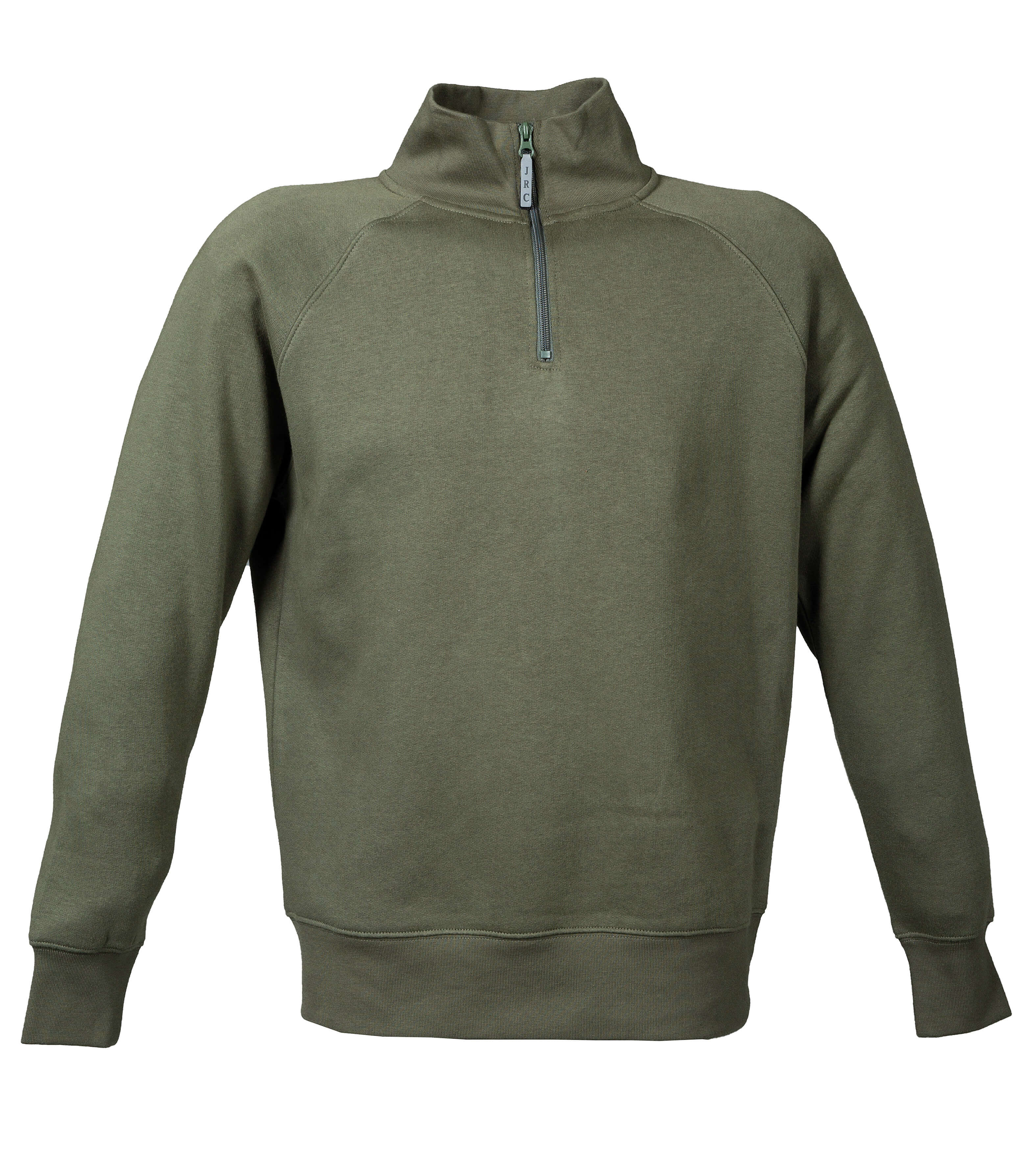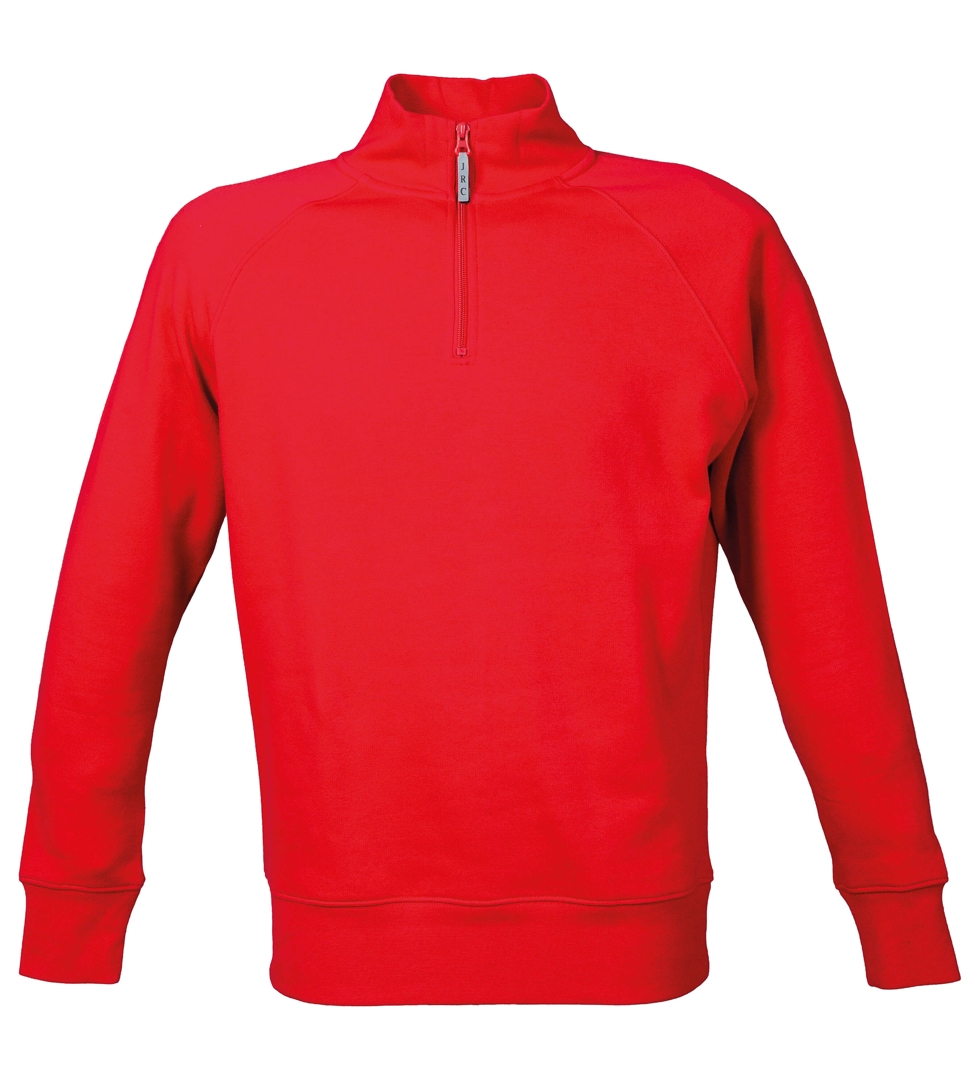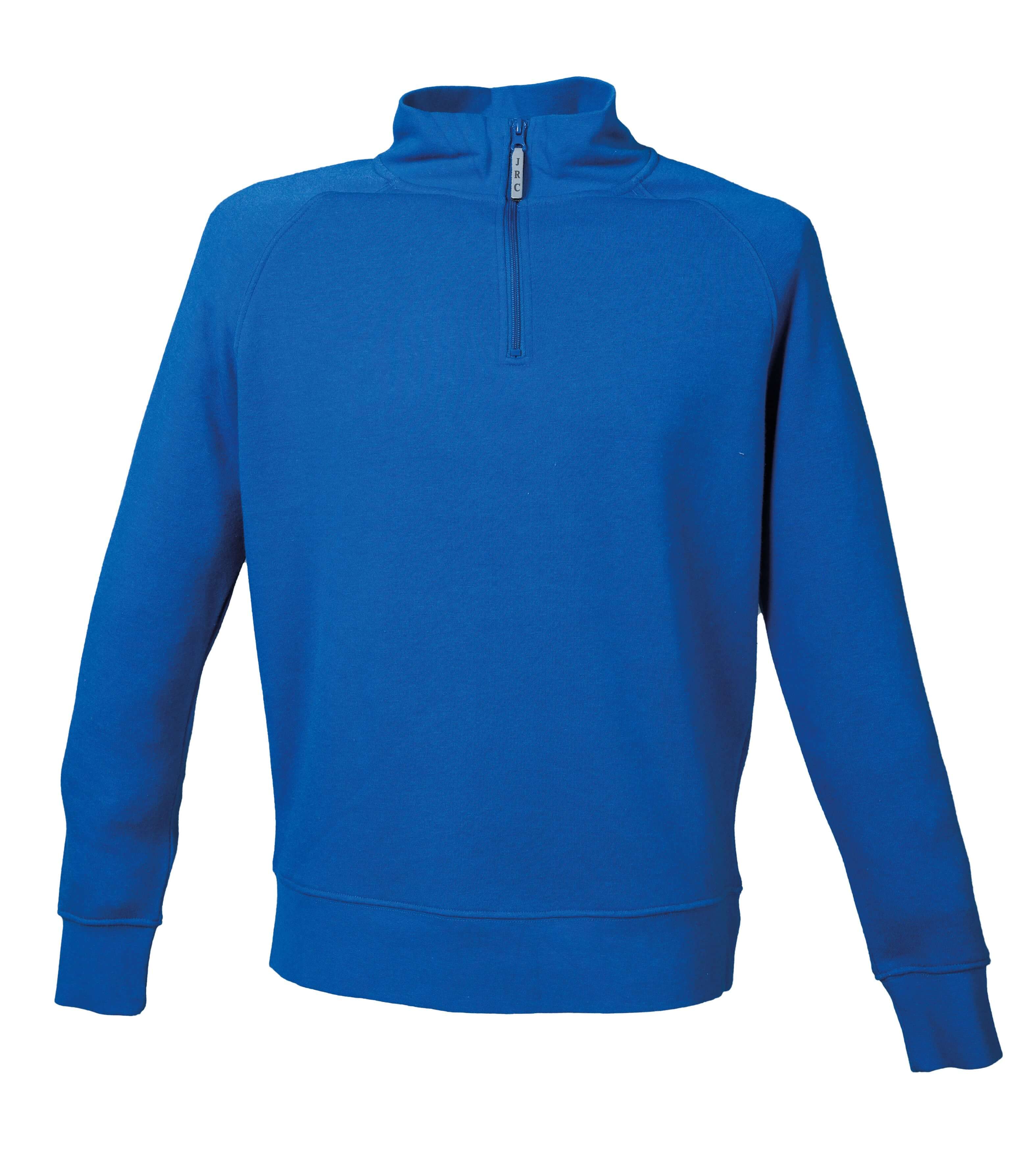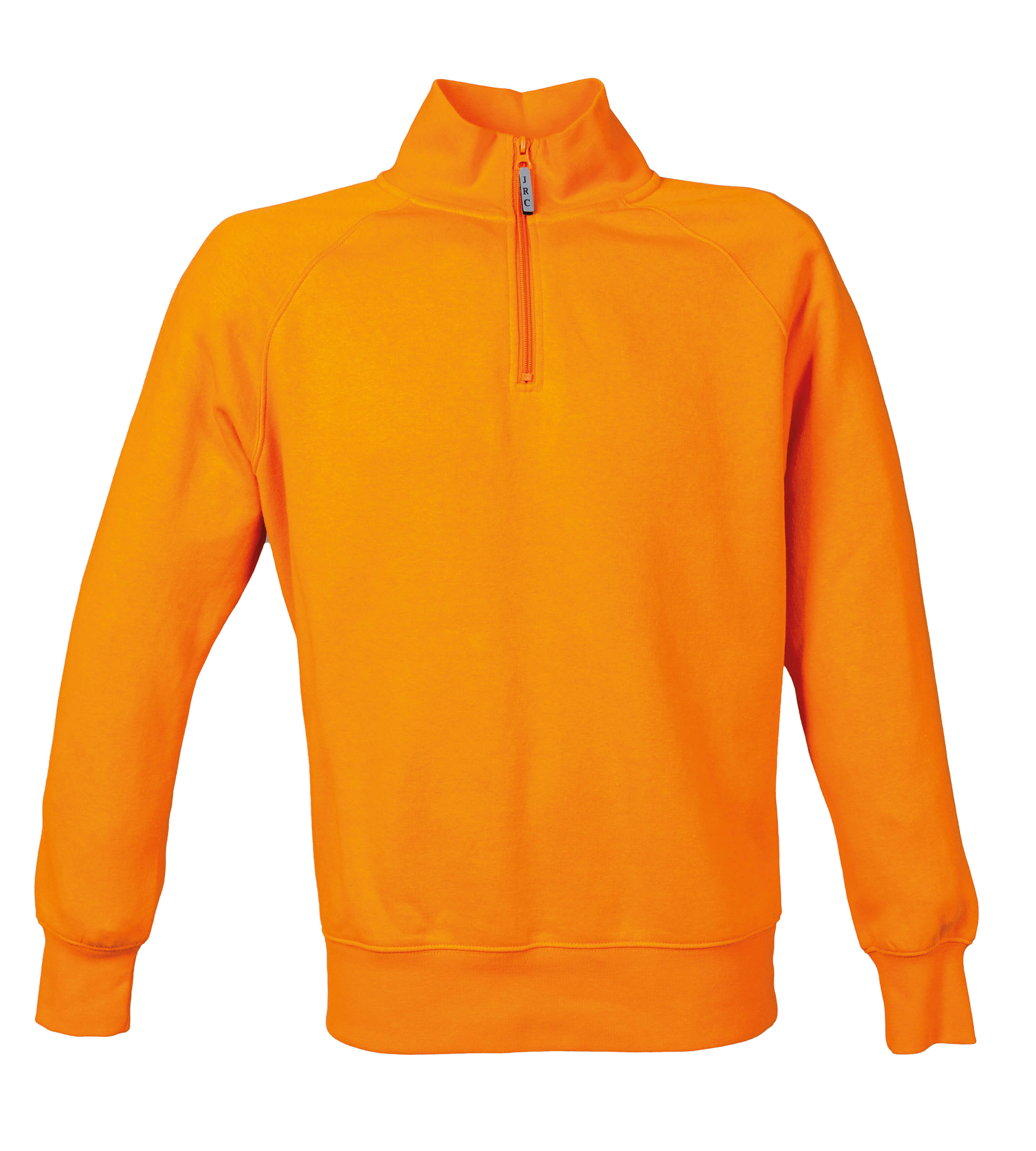 Felpa (80% cotone – 20% poliestere) con zip corta con tirazip rifrangente. Collo a lupetto. Maniche raglan. Mezzaluna di rinforzo dietro il collo. Collo, polsini e fondo maglia in costina elasticizzata. Nastro di rinforzo interno collo. Cuciture ribattute.