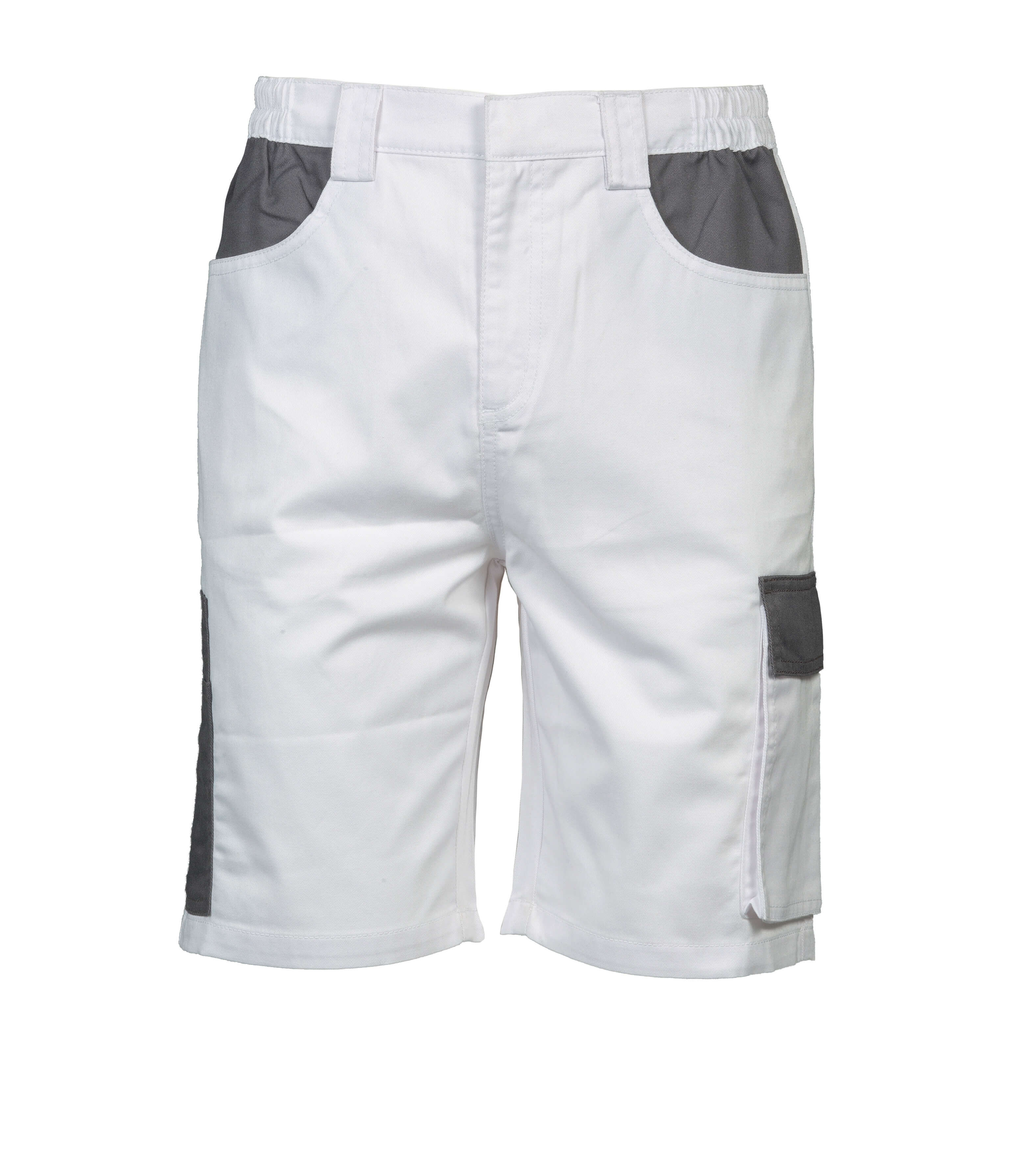 Pantalone corto multitasche (65% poliestere – 35% cotone). Dettagli in contrasto. Elastici in vita sui fianchi. Due tasche anteriori, una tasca laterale chiudibile con velcro, doppia tasca laterale portautensili o portametro e due tasche posteriori con velcro. Bottone automatico in vita coperto. Nessun elemento graffiante.