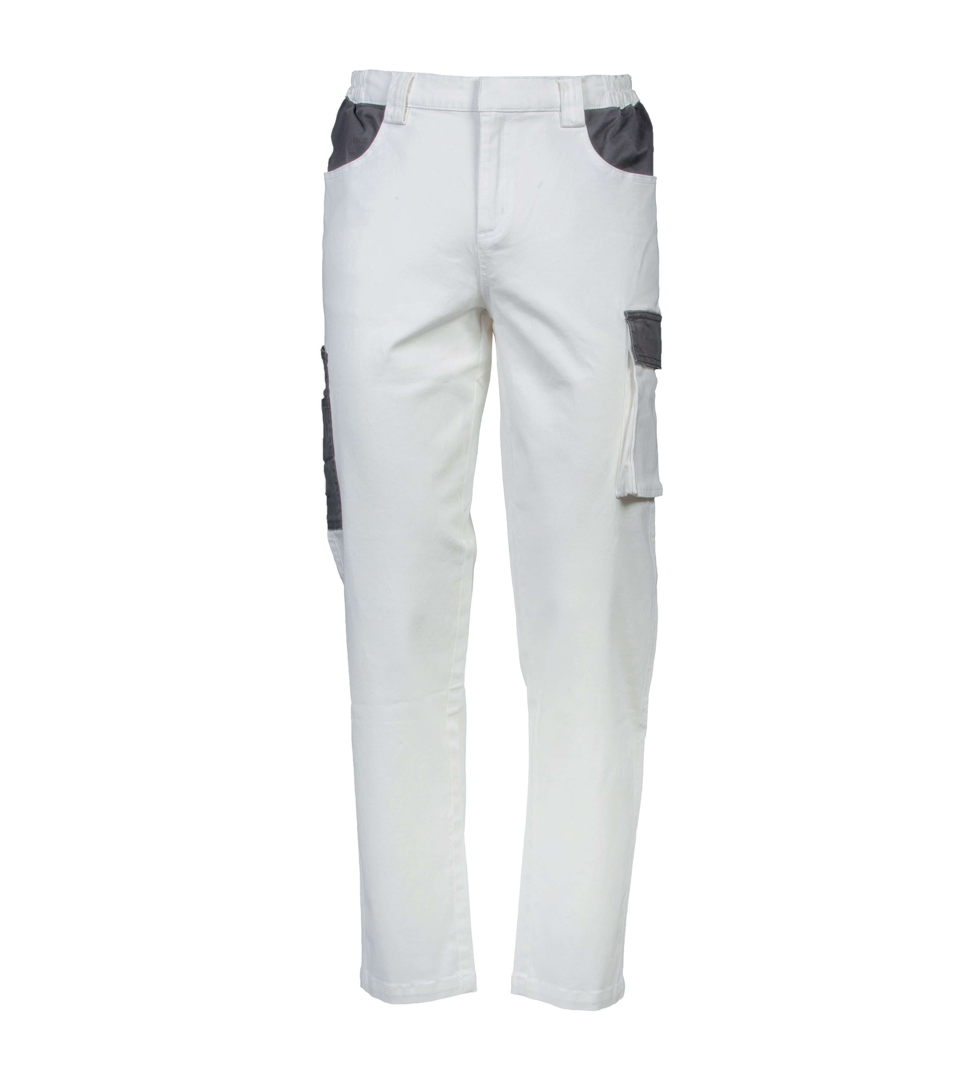 Pantalone multitasche (65% poliestere – 35% cotone). Dettagli in contrasto. Elastici in vita sui fianchi. Due tasche anteriori, una tasca laterale chiudibile con velcro, doppia tasca laterale portautensili o portametro e due tasche posteriori con velcro. Bottone automatico in vita coperto.