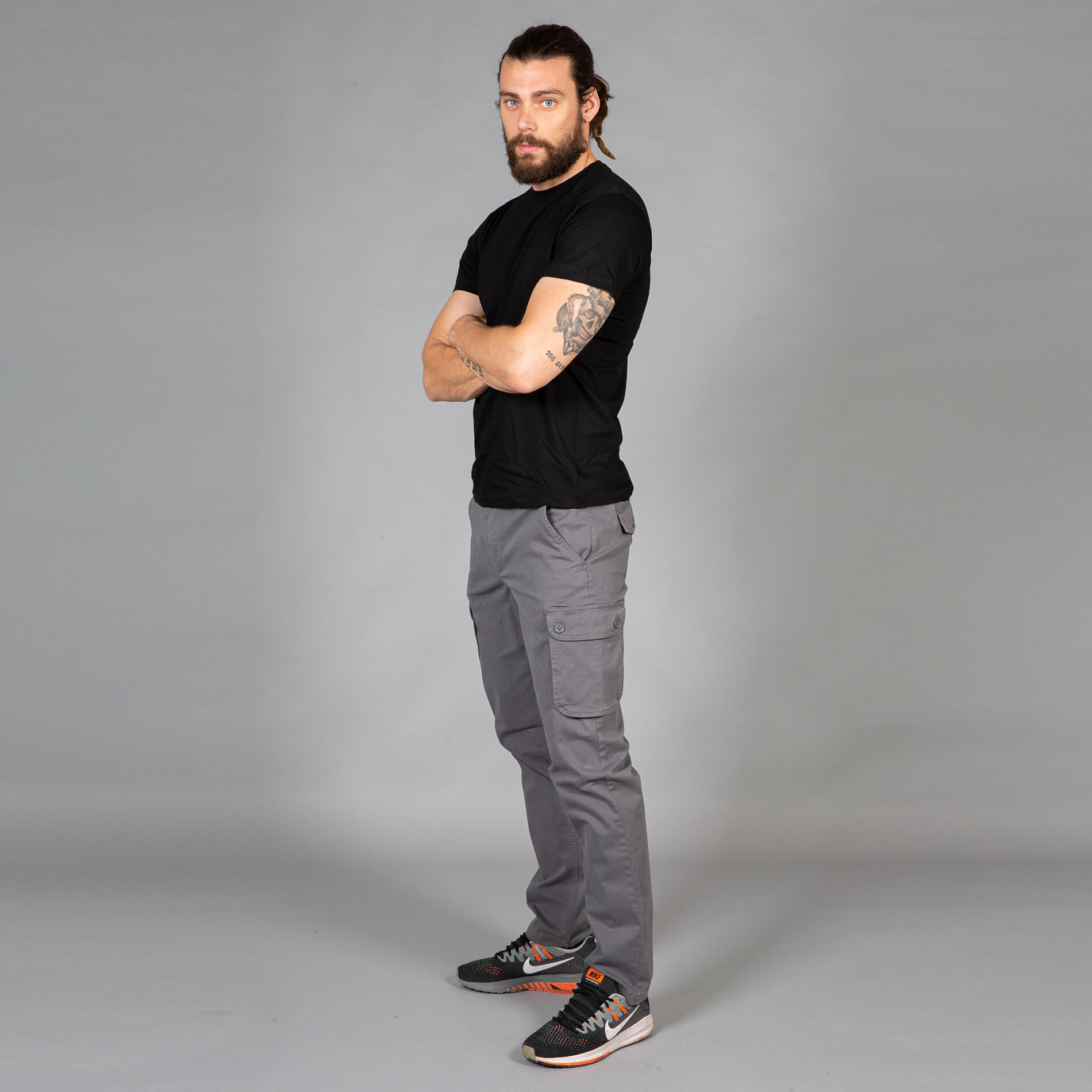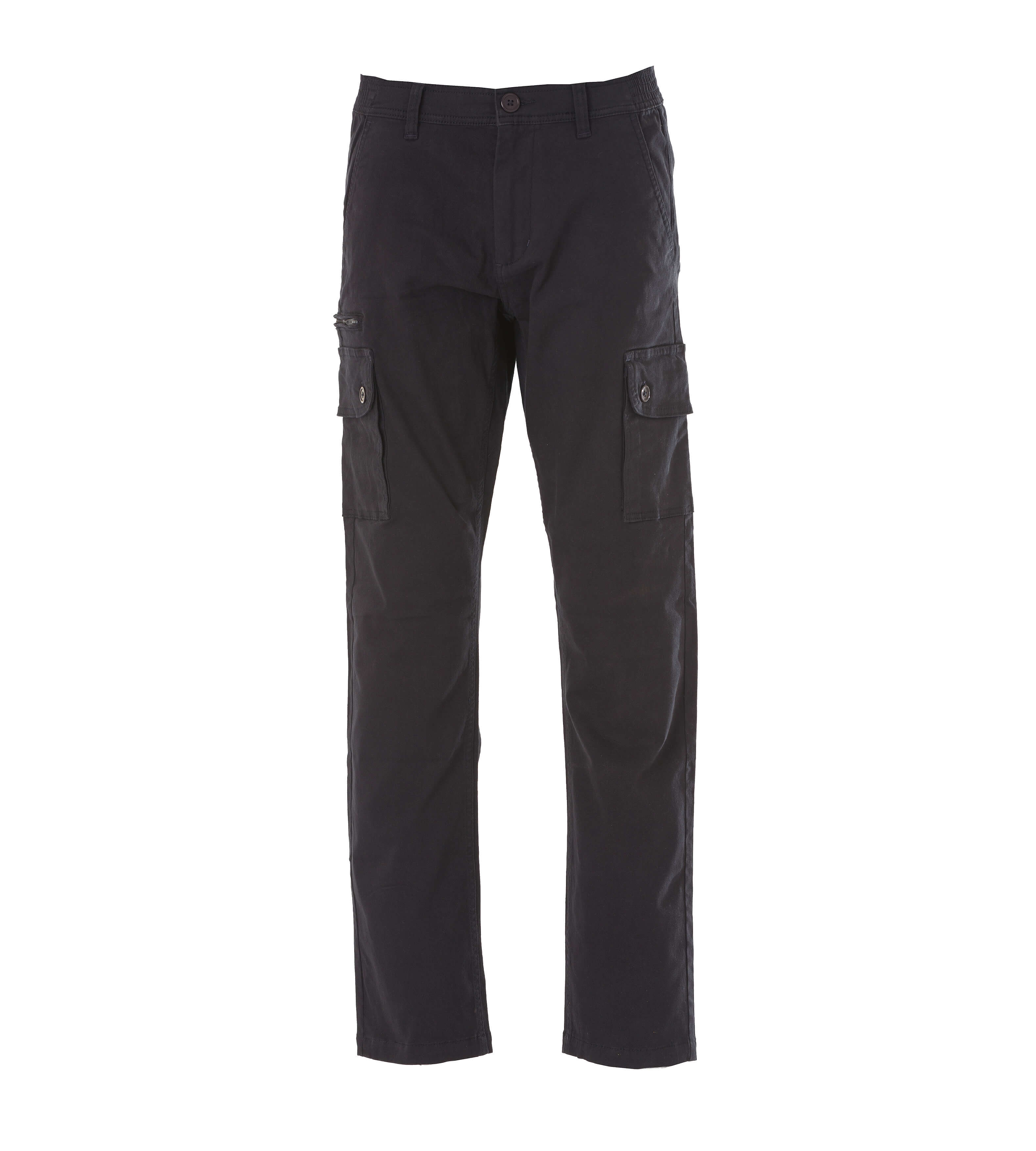 Pantalone multitasche elasticizzato (98% cotone – 2% elastane). Tessuto prelavato. Elastici in vita sui fianchi. Due tasche anteriori, due tasche laterali con bottoni, una tasca laterale con zip coperta, una tasca portametro e due tasche posteriori con bottoni.