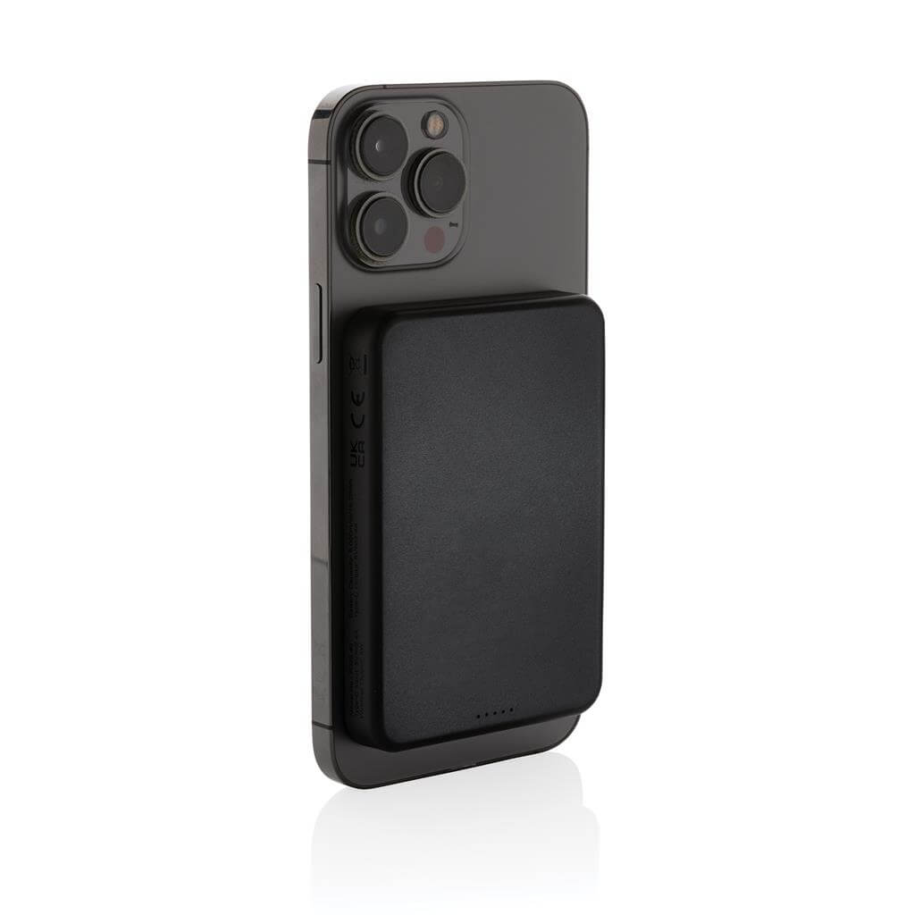 Powerbank tascabile da 5.000 mAh con caricatore wireless magnetico da 5W, la cui custodia è realizzata in plastica ABS riciclata (20%) certificata RCS. La powerbank contiene una batteria ai polimeri di litio di grado A da 5.000 mAh a lunga durata. Gli indicatori di potenza indicano il livello di energia rimanente, in modo da sapere sempre quando è necessario ricaricare. Input Type-C 5V/2.4A; Output Type-C 5V/2A.4A. Articolo e accessori senza PVC. Include un cavo di ricarica in TPE riciclato certificato RCS. Confezionato in scatola FSC® mix.