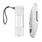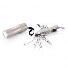 13 funzioni., coltellino tascabile in alluminio anodizzato con grande lama, sega, togli squame, estrattore di chiodi, forbici, cavatappi, cacciavite a taglio, apri lattine, cacciavite a stella, piccola lama, limetta e punteruolo e in aggiunta torcia in alluminio anodizzato con 9 LED. Confezionato in scatola nera magnetica. Batterie incluse.