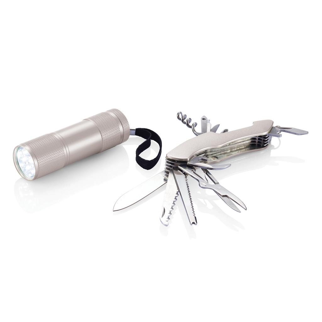 13 funzioni., coltellino tascabile in alluminio anodizzato con grande lama, sega, togli squame, estrattore di chiodi, forbici, cavatappi, cacciavite a taglio, apri lattine, cacciavite a stella, piccola lama, limetta e punteruolo e in aggiunta torcia in alluminio anodizzato con 9 LED. Confezionato in scatola nera magnetica. Batterie incluse.