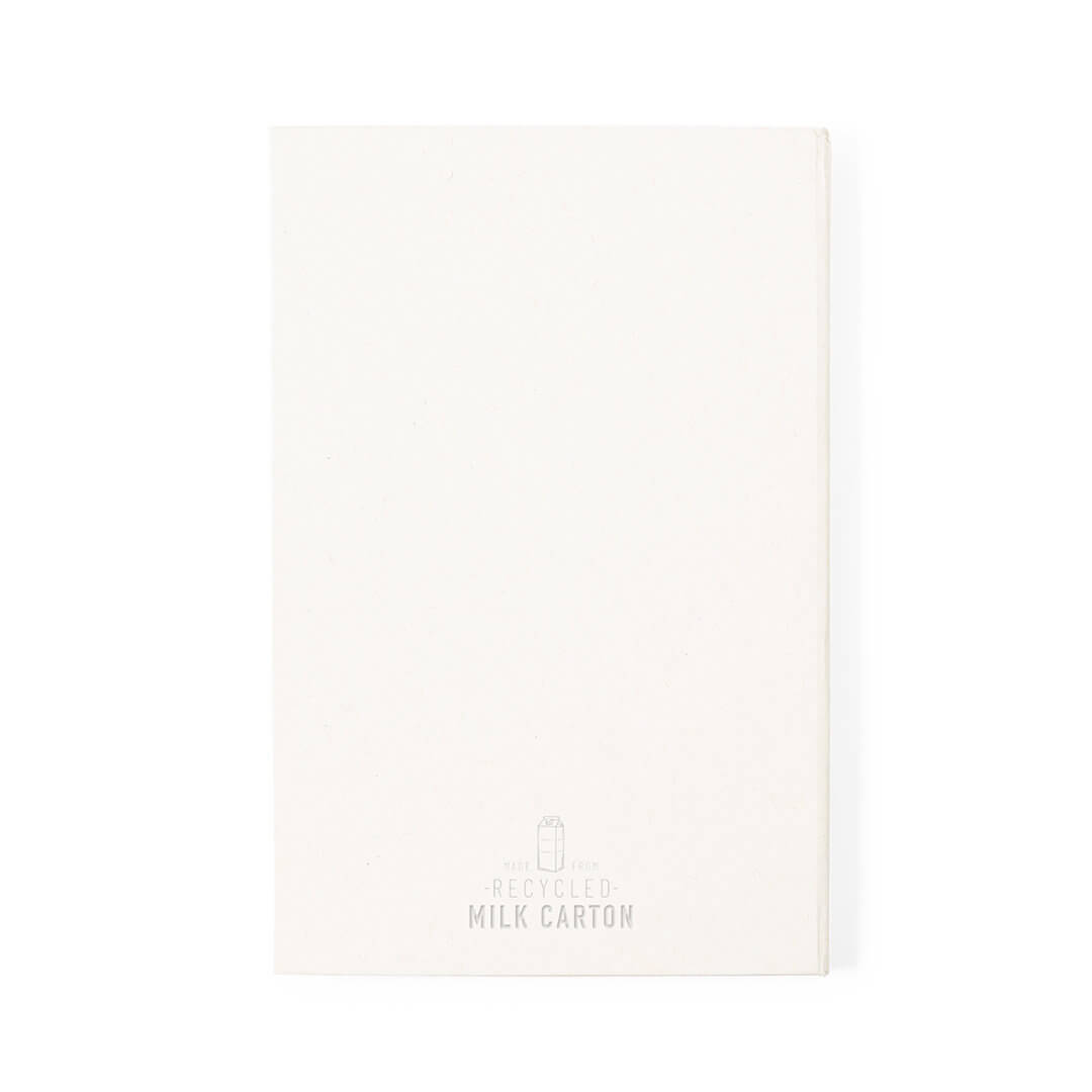 Taccuino con copertina rigida realizzata con cartoni del latte riciclati. Durante il processo di riciclaggio, i diversi materiali d’imballaggio vengono separati per essere riutilizzati e reimpiegati, contribuendo così all’infinito percorso dell’economia circolare. Questo materiale è caratterizzato da un elevato grado di riciclabilità, oltre che da leggerezza e resistenza. Dicitura cartone del latte riciclato sul retro. 100 fogli a righe