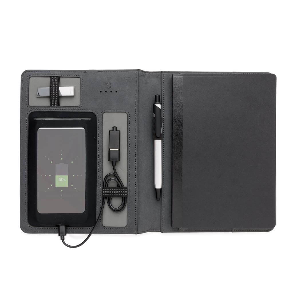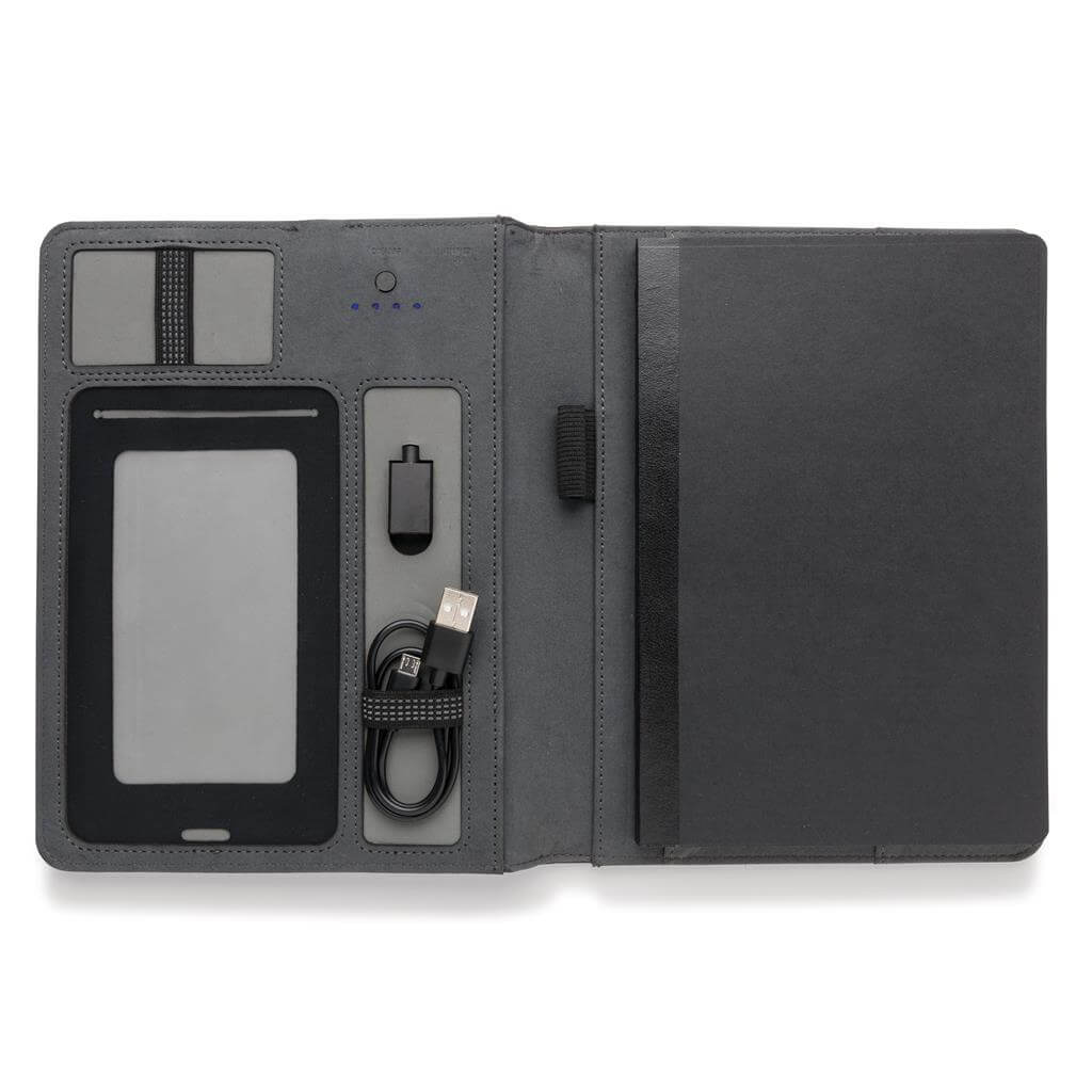 Copertina in tessuto. 128 pagine color crema da 80 g/m2. Powerbank da 3000 mAh integrata. Include una finestrella trasparente (15 x 8 cm) porta smartphone. Output: 5V/1A. Ideale per congressi e convegni.