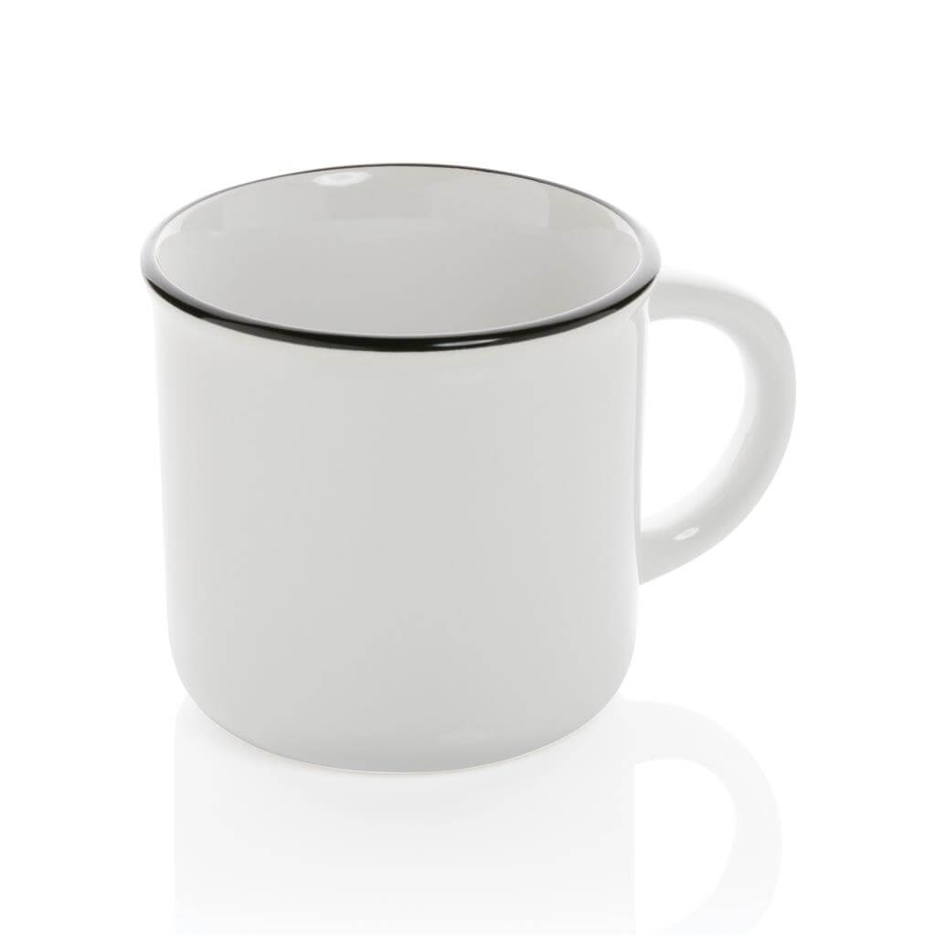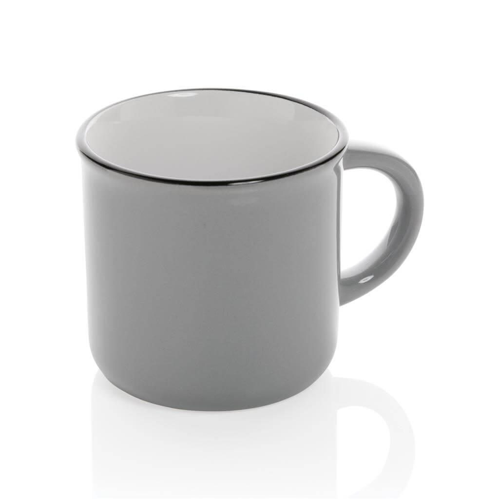 La tazza, realizzata in ceramica, ha un aspetto vintage e presenta un manico curvo per una facile presa.